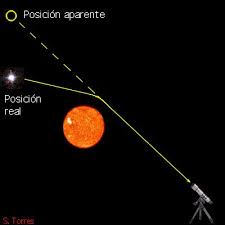Assim sendo, a luz das estrelas ou qualquer luz que recebemos aqui na terra sofre uma "distorção" quando passa muito proximo a corpos celestes pesados, a distorção espaço temporal no "Tecido Espacial" é como uma bola de boliche colocada sobre um pano esticado, as bordas do pano continuam onde estão, enquanto que o pano debaixo da bola estica-se e afunda curvando-se para baixo, a curvatura é relativa e diretamente proporcional à massa do corpo celeste segundo a lei da gravitação clássica de Newton, e quando a luz passa por esse "tecido" curvado a sua tragetoria também se curva... demonstração abaixo: